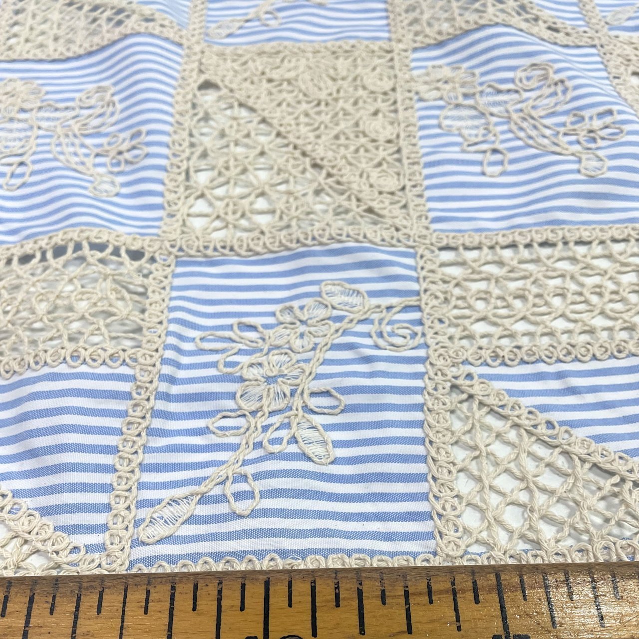 Тонкая смесовая ткань с интересным принтом из вставок с льняной вышивкой. Хорошо впитывает влагу, комфортна при носке. Держит форму. Прекрасно подходит для пошива платьев, сорочек, одежды в спортивном и романтичном стиле. Особо модная полоска и сочетание фактур позволит не только сшить изделие классической формы, но и поэкспериментировать с геометрией рисунка.